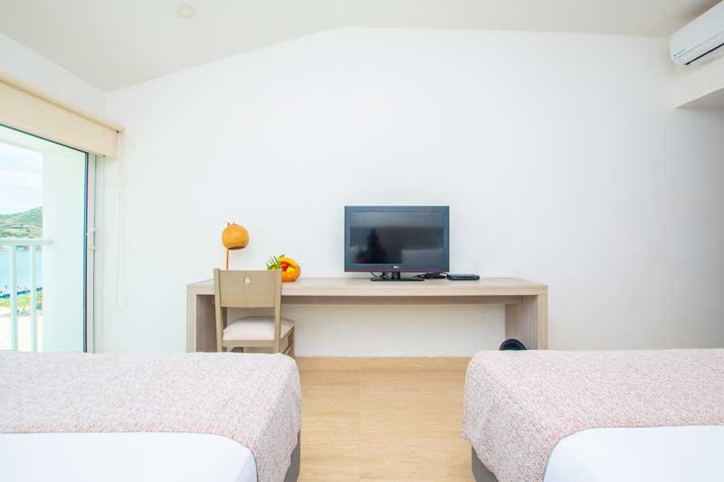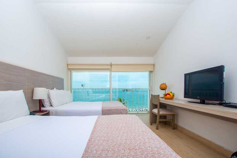 Con capacidad para 4 personas, estas habitaciones son ideales para familias o grupos de amigos que buscan comodidad frente al mar. Están equipadas con dos camas dobles, aire acondicionado individual, WiFi gratuito, TV con canales internacionales, baño privado con amenidades completas, caja fuerte, secador de cabello y clóset.